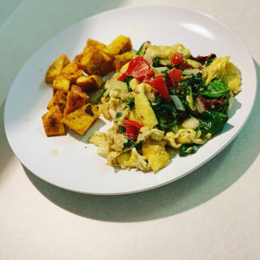 The first meal of the day…. most of the time not the case for me. I love breakfast foods, and will often eat breakfast for lunch or dinner, but eating in the morning isn’t usually something I partake in. But when I do, I really do. If I’m going to eat breakfast, I’ll either make eggs, avocado, and potatoes, or banana pancakes with fruit, or a breakfast burrito, or a ginormous bowl of cereal, a smoothie bowl, maybe some pasta. Really, the possibilities are endless for me when it comes to eating breakfast at breakfast time especially since eating in the morning only really happens if I’m craving something. My first post was about cravings, well, when they hit they hit when I first wake up. The photo I attached was of something I made for breakfast not too long ago. I made an egg scramble with spinach, onions, red bell peppers, and cherry tomatoes along with some roasted sweet potato. Needless to say, I ate it all… and maybe had a second (smaller) plate of it. Let me know if you’d like any more of my breakfast recipes savory or sweet!